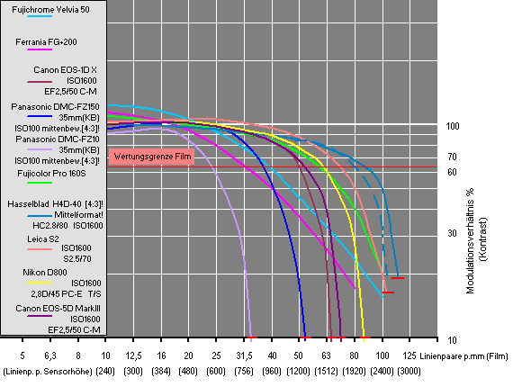 Der Fujichrome Velvia 50, Fujicolor Pro 160S sowie ein ISO200-Farbnegativfilm im Vergleich zu einer Auswahl von älteren und jüngeren D-SLR, Bridge- und Mittelformatkameras. Für Kameras mit Sensoren im 4:3-Format ergeben sich in unmittelbarer Gegenüberstellung mit 3:2-Sensoren geometrisch bedingte Vorteile. (Ein auf die Sensorformathöhe der Leica S2 [3:2] reduzierter Bildaufnehmer der Hasselblad H4D-40 würde mit 36,345 Megapixel dem gestrichelt angegebenen Kurvenverlauf folgen.) Ohne Berücksichtigung weiterer einsatzspezifischer Anforderungen an besonders hochauflösende Digitalkameras sollten diese im Wesentlichen von der Qualität optischer Systemkomponenten bestimmten MTF-Grenzwerte, so einschließlich der Nikon D800(E), nicht überbewertet werden! |