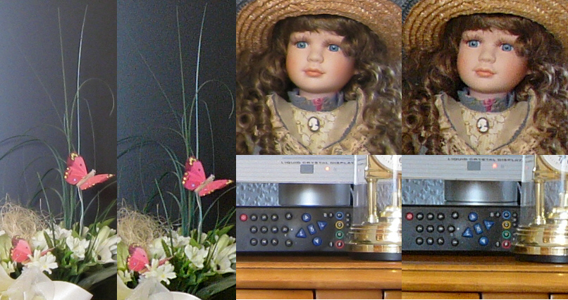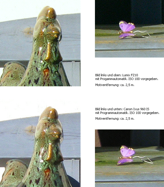 Linke Bildausschnitte: Canon Ixus 960IS, rechte Teilbilder: Lumix DMC-FZ10. Auch hier erfolgte die Kamerabildspeicherung im JPG-Format mit geringst möglicher Kompression: 1650 kB bei der FZ10 und 4900 kB bei der Ixus 960IS. (Bei einer Vorgabe von jeweils ISO 400 Lichtempfindlichkeit liefert die FZ10 gegenüber der Ixus erheblich auffälligere Vergrieselungen.) |