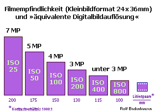 Die ausgewiesenen Pixelangaben repräsentieren praxisnahe Mittelwerte bei bestmöglichen Eigenschaften von Optik und Bildsensor. Die Relationen der jeweils spezifizierten Lichtempfindlichkeit zur wesentlich aussagekräftigeren Linienpaar-Auflösung (zitiert nach Angaben von Kodak, 1999) können nach dem Produktentwicklungsstand verschiedener Filmhersteller – so aus der Weiterentwicklung ihrer Emulsionstechnologie vor allem für Farbnegativfilme – entsprechend unterschiedlich ausfallen (siehe unten). Nach den Auflösungsmarken zu ISO50 und ISO100 kommt die obige Tabelle somit eher den Eigenschaften aktueller Farbumkehrfilme nahe, vgl. unten mit # angegebene Filme. |