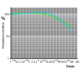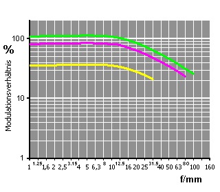 Darstellungen von Film-MTF und Digitalkamera-Auflösungen in einem gemeinsamen Diagramm können insofern kritisch gesehen werden, als auf keine physikalisch greifbare Grundlage zur rechnerischen Transformation von Filmauflösung in einen entsprechenden Darstellungskontext digitaler Bildwandlersysteme zurückgegriffen werden kann. Wie bereits weiter oben angemerkt können kalkulatorische Anhaltspunkte daher nur über visuelle bzw. messoptografische Bewertungen erschlossen werden. Des Weiteren können für nicht näher untersuchtes Filmmaterial (hier z. B. Kodak Farbwelt 100/200/400) und der vom Verfasser als Konstante angegebenen Wertungsgrenze zur Filmauflösung produktspezifische Abweichungen nicht ausgeschlossen werden. |